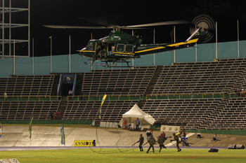 The highlight of the Jamaica Military Tattoo for most people who attended the show could come down to one of two displays. First the parachuters from the Guyanese Defence Force Parachuting Team, who kept everyone wondering they would land in the crowds and miss their target. They jumped from the JDF helicopter, from one mile in the air. All four jumpers met their on the ground targets and thrilled the Jamaican crowds in the process.