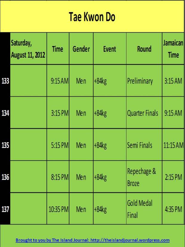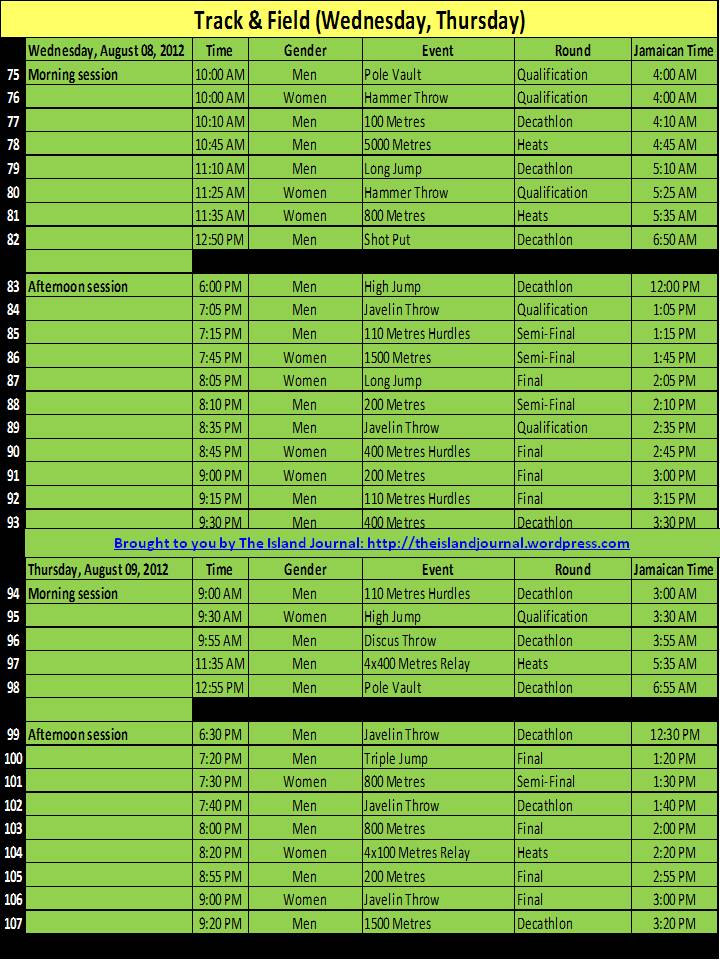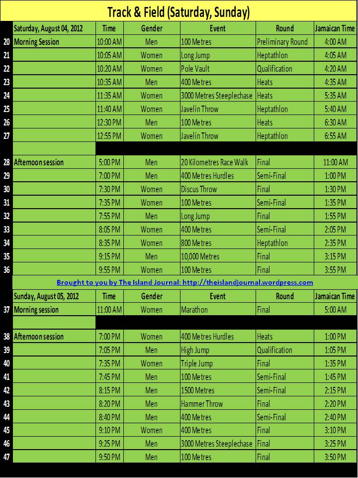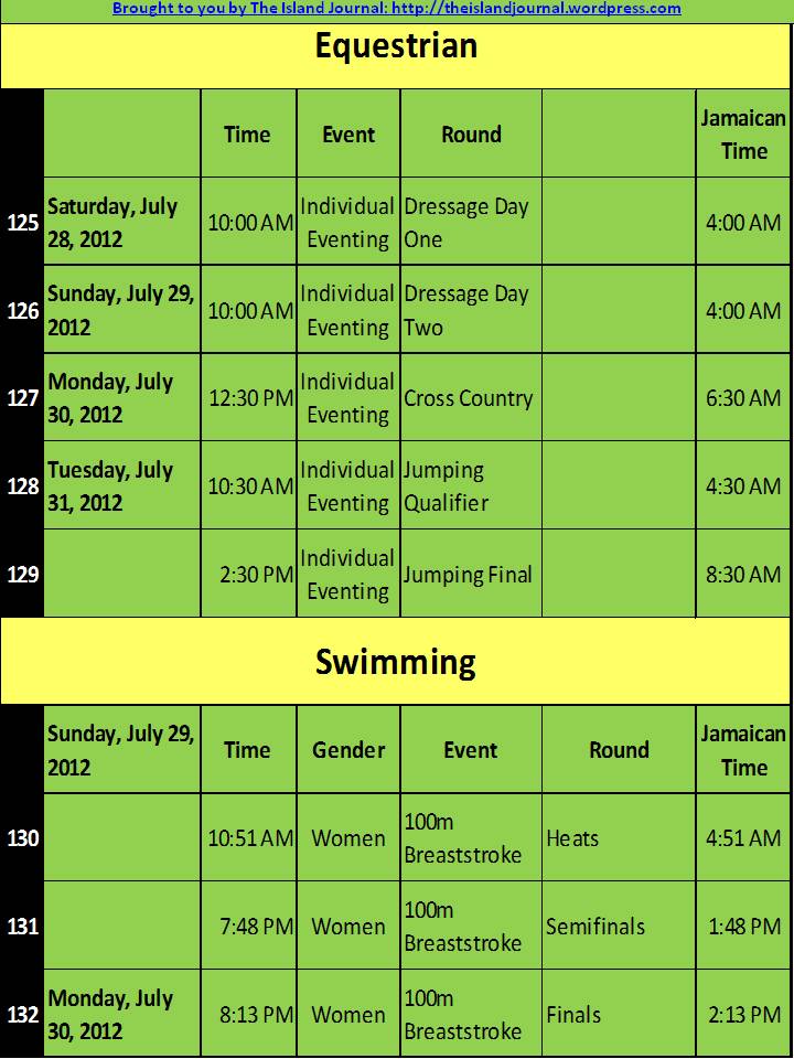 See below for all the events, rounds, dates, days and times of the Jamaica’s 2012 Olympic Schedule: