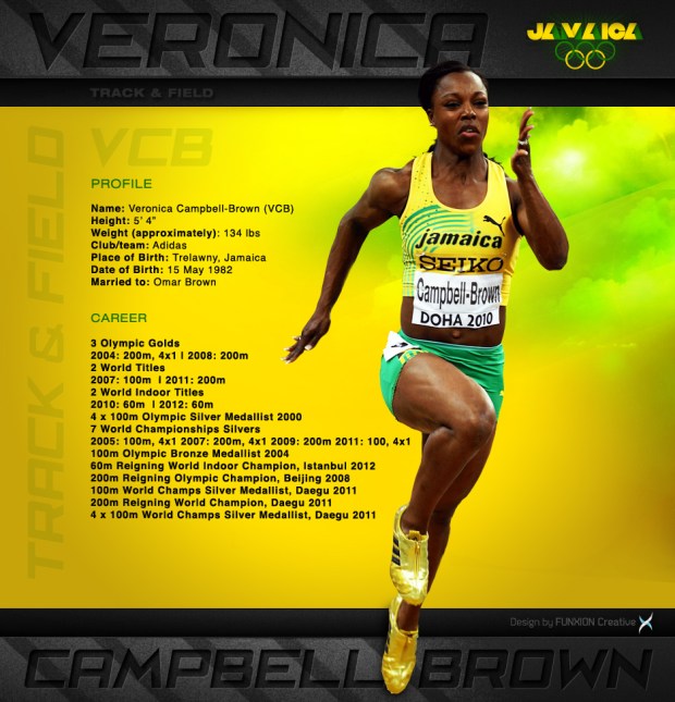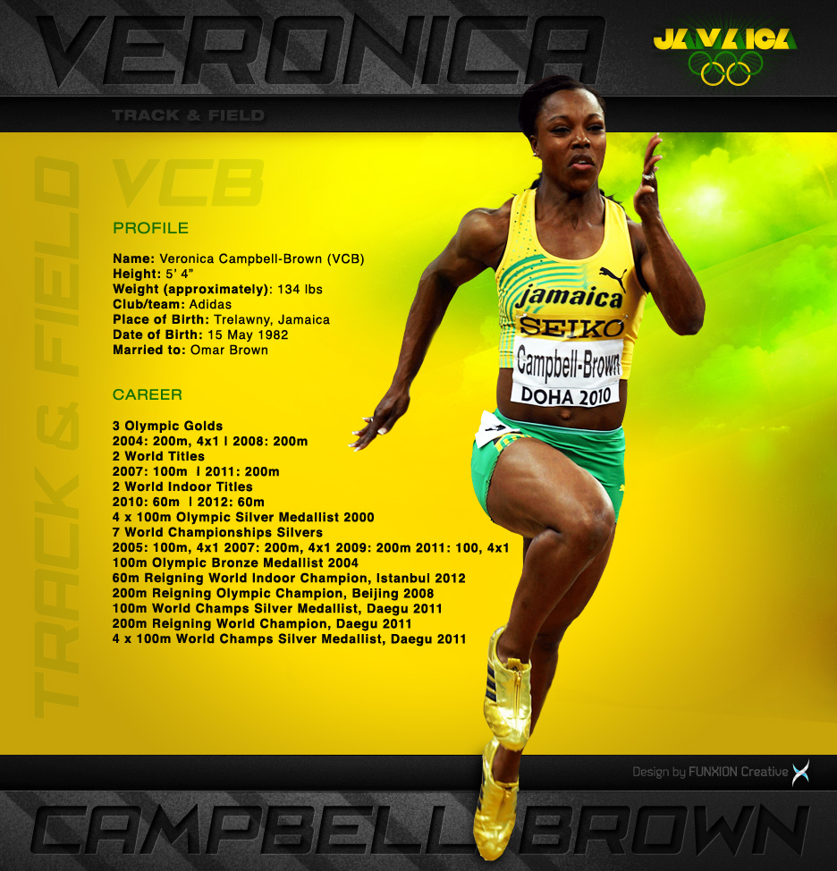 According to Wikipedia, Veronica Campbell-Brown C.D (born 15 May 1982) is a Jamaican track and field sprint athlete who specializes in the 100 and 200meters.[1] A five-time Olympic medalist, she is the reigning World and Olympic 200 m champion. At the 2008 Beijing Olympics, she ran the 200 m in 21.74 seconds (the fastest time in a decade) and became the second woman in history to win two consecutive Olympic 200 m events, after Bärbel Wöckel of Germany at the 1976 and 1980 Olympics.[2] Campbell-Brown is one of only eight athletes to win world championships at the youth, junior, and senior level of an athletic event.
