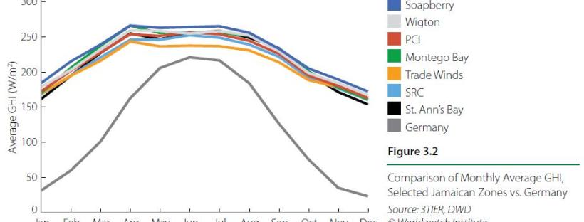 The Worldwatch Institute in its recently published “Jamaica Sustainable Energy Roadmap– Pathways to an Affordable, Reliable, Low-Emission Electricity System” revealed that Jamaica has a tremendous solar potential with global horizontal irradiance (or GHI) ranging from 5 to 7 kWh per square meter per day (kWh/m2/day) throughout most of the country. According to the Institute some parts of Jamaica have an even higher GHI, reaching up to 8 kWh/m2/day. To put things in perspective, Germany, which has nearly half of the world’s installed solar PV capacity, has very few locations with a GHI above 3.5 kWh/m2/day.