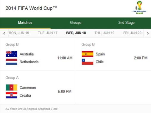 Match Schedule for Wednesday, June 18, 2014 Previous Published June 12, 2014 at 960 × 720 in 2014 FIFA World Cup – Match Schedule for June 12 – 26, 2014 Match Schedule for Wednesday, June 18, 2014 Match Schedule for Wednesday, June 18, 2014