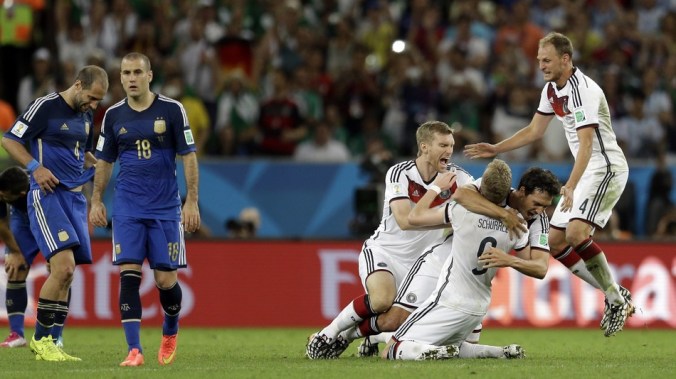 German players celebrate their 1-0 World Cup victory in extra time during the final soccer match between Germany and Argentina Previous Next Published July 14, 2014 at 950 × 534 in 2014 FIFA World Cup: Germany wins 2014 FIFA World Cup! German players celebrate their 1-0 World Cup victory in extra time during the final soccer match between Germany and Argentina German players celebrate their 1-0 World Cup victory in extra time during the final soccer match between Germany and Argentina