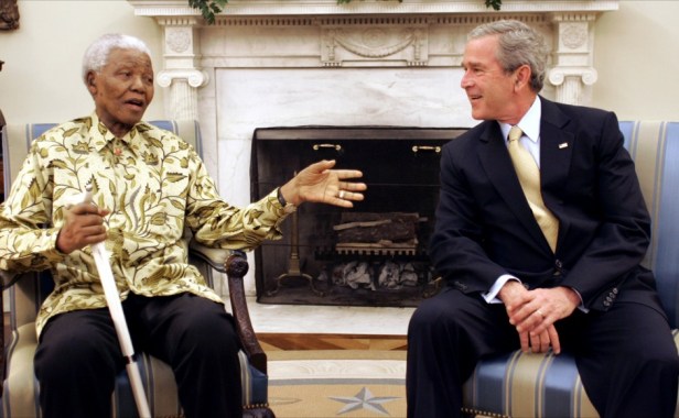 U.S. President George W. Bush meets with former South African President Nelson Mandela in the Oval Office of the White House, May 17, 2005. Mandela yesterday said that he backs Bush’s call for global “liberty” but disagrees with some of his methods. REUTERS/Kevin Lamarque KL/HB – RTRBFNA