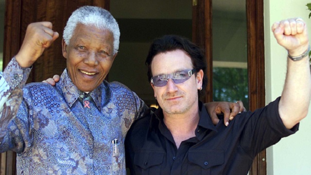 CPT01 – 20020525 – JOHANNESBURG, SOUTH AFRICA : Irish rock star Bono (R) and former South African president Nelson Mandela are pictured after a meeting at Mandela’s home in Johannesburg 25 May 2002. Bono and US Treasury Secretary Paul O’Neill are in the country on the second leg of their African tour to highlight the need for development aid to the world’s poorest continent.