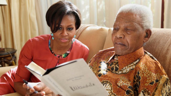 In this photo provided by the Nelson Mandela Foundation on Tuesday, June 21, 2011, US First Lady Michelle Obama, left, with former South African President Nelson Mandela, at this home, in Houghton, South Africa. First lady Michelle Obama and her family met with Nelson Mandela during a private visit at the former South African president’s home. Mrs. Obama, daughters Malia and Sasha, and her mother, Marian Robinson, were viewing some of Mandela’s personal papers at his foundation Tuesday when according to White House officials, he sent word that he wanted to meet them. It was Mrs. Obama’s first meeting with the prisoner-turned-president. (AP Photo/ Debbie Yazbek, Nelson Mandela Foundation) EDITORIAL USE ONLY