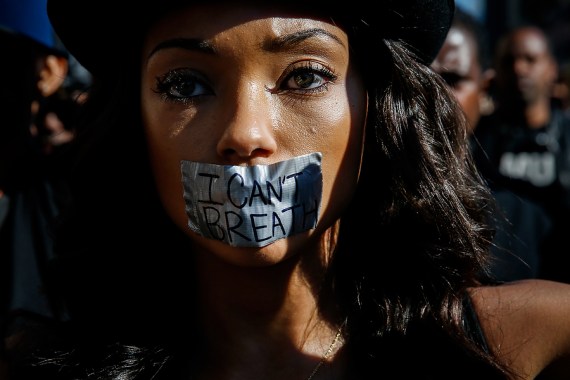 Protester Logan Browning wears tape over her mouth reading “I can’t breathe” while demonstrating against the shooting of a man by the Los Angeles Police Department in Hollywood, California