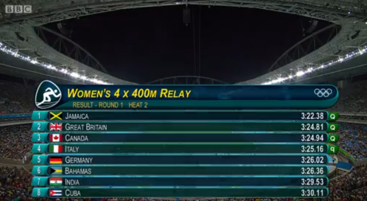 women 4x400m (3) Previous Next Published August 19, 2016 at 731 × 401 in Rio Olympics: Photo Highlights and Results Of The 4x400m Men’s Relay Round 1