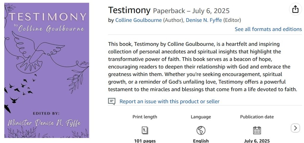 This book, Testimony by Colline Goulbourne, is a heartfelt and inspiring collection of personal anecdotes and spiritual insights that highlight the transformative power of faith. Colline shares her journey of divine encounters, miraculous interventions, and unwavering trust in God’s plan. This book serves as a beacon of hope, encouraging readers to deepen their relationship with God and embrace the greatness within them. Whether you’re seeking encouragement, spiritual growth, or a reminder of God’s unfailing love, Testimony offers a powerful testament to the miracles and blessings that come from a life devoted to faith.