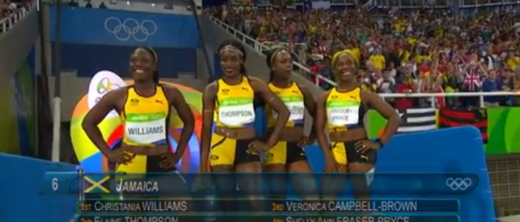 It was a highly anticipated final and Jamaica did not disappoint, at the Rio 2016 Olympics in the 4x100m Relay Women Final. The lineup included Shelly Ann Fraser Pryce, Elaine Thompson, Veronica Campbell Brown, and Christania Williams. The race was over in a flash as the USA and Jamaica zipped around the track with Great Britain … Continue reading Sports Highlights: Olympics 4x100m Relay Final with Jamaican Women Fraser-Pryce, Thompson, Brown & Williams